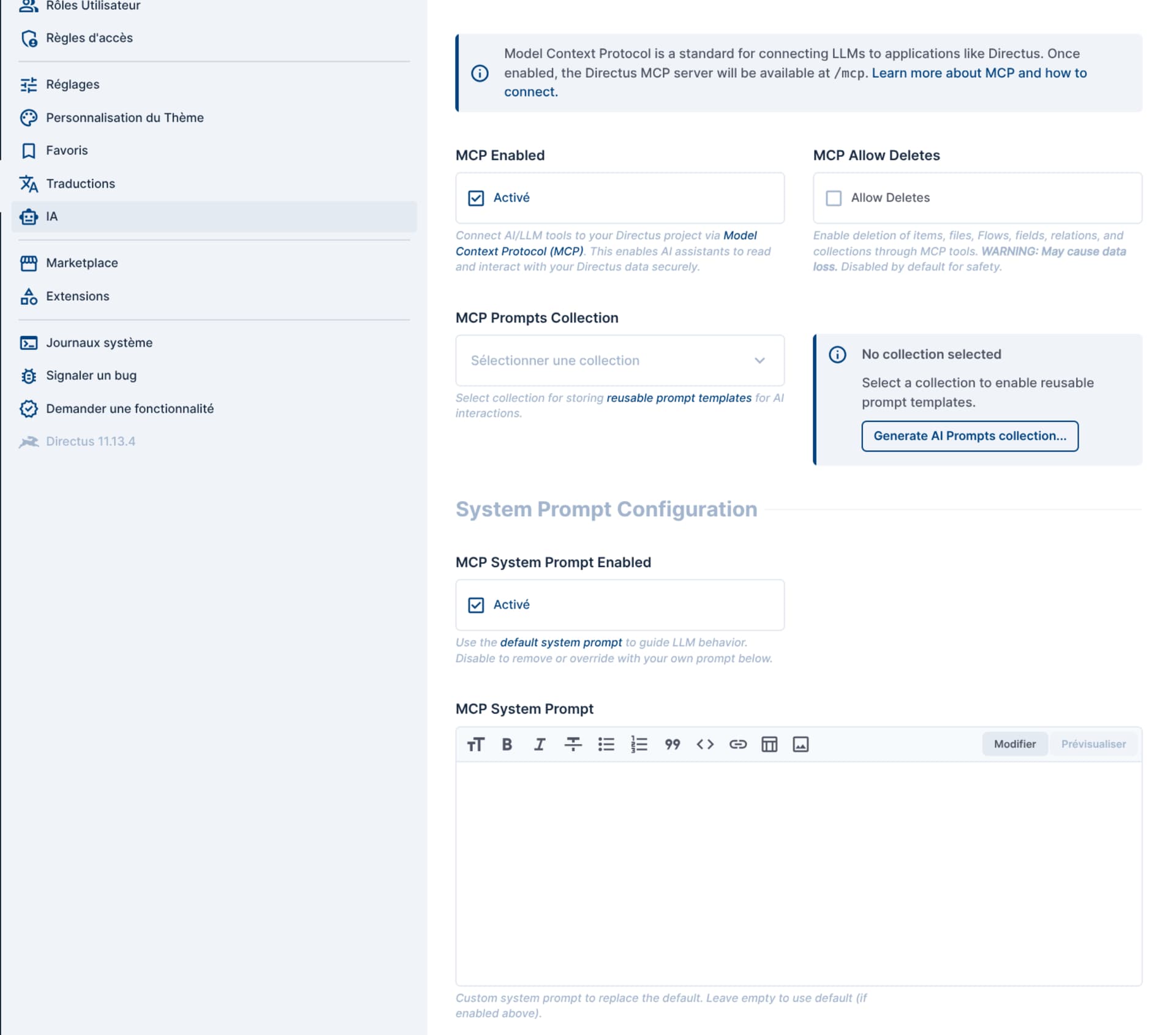 Petite astuce pour ceux qui codent avec l’IA et Directus, il est possible de faire communiquer directement l’agent IA (testé avec Claude Codex 4.5 et Gemini 3) avec le serveur Directus à via le serveur MCP.